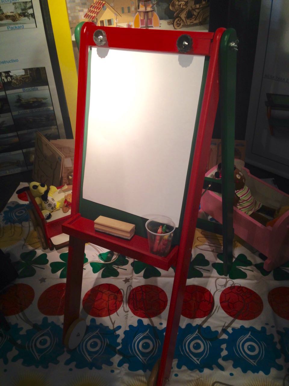 Atril de pie, plegable con ruedas (2). Pizarra doble faz: una cara imantada color blanco apta también escritura con fibra, otra cara pizarrón. Apto también para colocar hojas de papel A3.